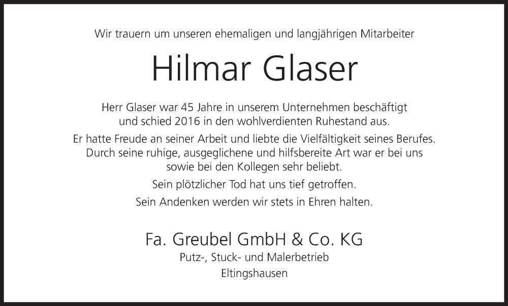 Hier finden Sie alle Traueranzeigen aus der Zeitung, die bisher für Hilmar Glaser erschienen sind. Weitere Traueranzeigen, die in der Zeitung erscheinen, werden hier ebenfalls aufgelistet