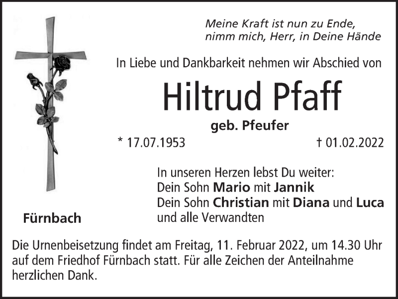 Hier finden Sie alle Traueranzeigen aus der Zeitung, die bisher für Hiltrud Pfaff erschienen sind. Weitere Traueranzeigen, die in der Zeitung erscheinen, werden hier ebenfalls aufgelistet
