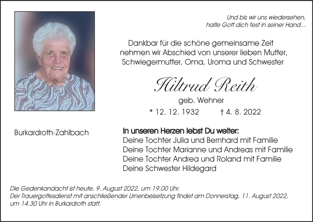 Hier finden Sie alle Traueranzeigen aus der Zeitung, die bisher für Hiltrud Reith erschienen sind. Weitere Traueranzeigen, die in der Zeitung erscheinen, werden hier ebenfalls aufgelistet