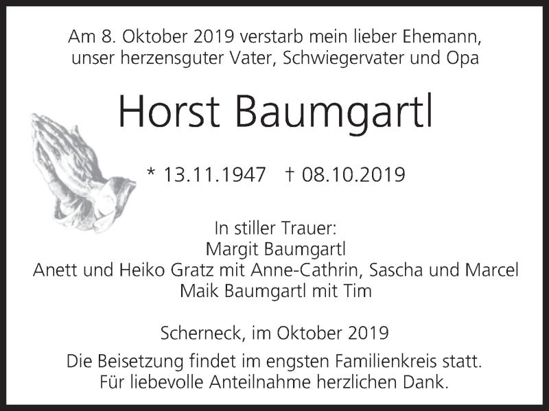 Hier finden Sie alle Traueranzeigen aus der Zeitung, die bisher für Horst Baumgartl erschienen sind. Weitere Traueranzeigen, die in der Zeitung erscheinen, werden hier ebenfalls aufgelistet