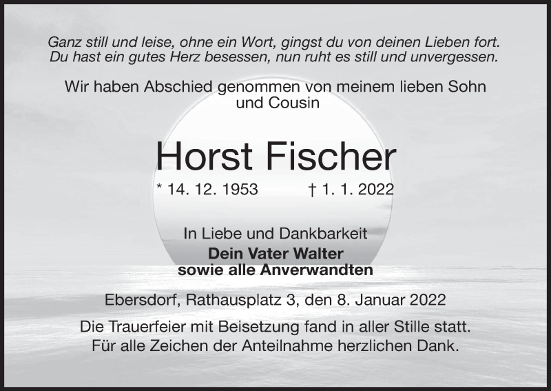 Hier finden Sie alle Traueranzeigen aus der Zeitung, die bisher für Horst Fischer erschienen sind. Weitere Traueranzeigen, die in der Zeitung erscheinen, werden hier ebenfalls aufgelistet