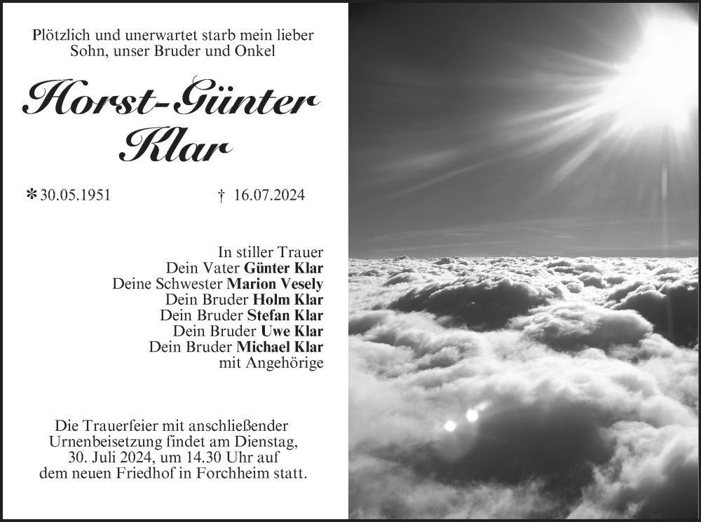 Hier finden Sie alle Traueranzeigen aus der Zeitung, die bisher für Horst-Günter Klar erschienen sind. Weitere Traueranzeigen, die in der Zeitung erscheinen, werden hier ebenfalls aufgelistet