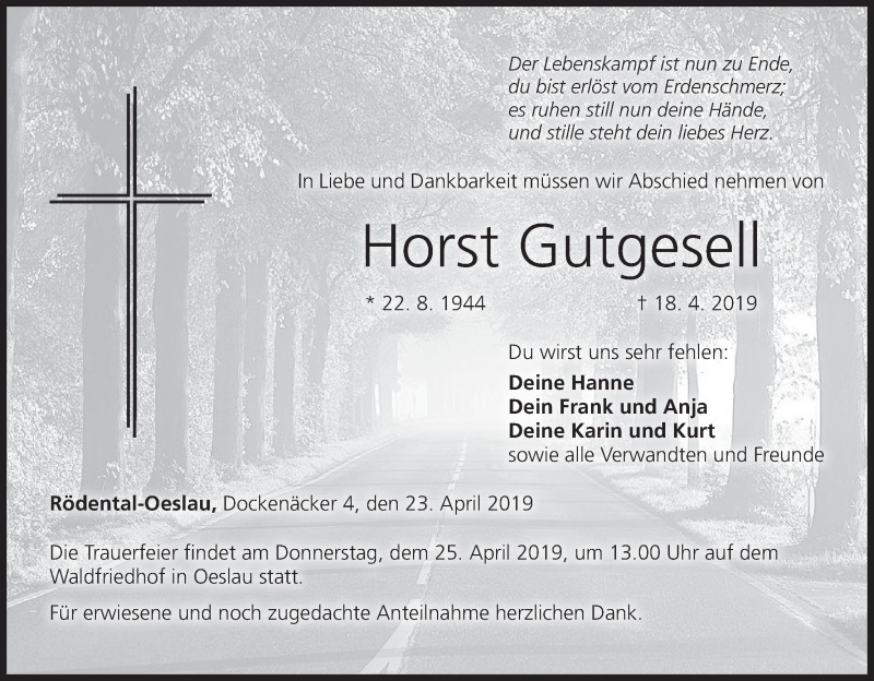 Hier finden Sie alle Traueranzeigen aus der Zeitung, die bisher für Horst Gutgesell erschienen sind. Weitere Traueranzeigen, die in der Zeitung erscheinen, werden hier ebenfalls aufgelistet