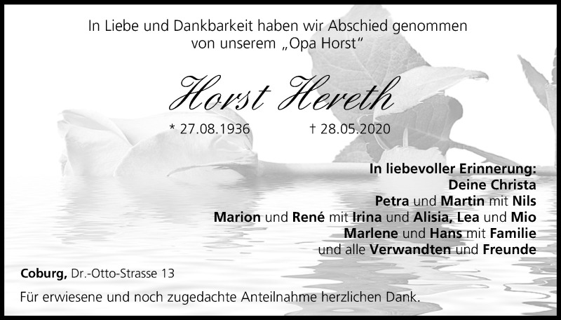 Hier finden Sie alle Traueranzeigen aus der Zeitung, die bisher für Horst Hereth erschienen sind. Weitere Traueranzeigen, die in der Zeitung erscheinen, werden hier ebenfalls aufgelistet