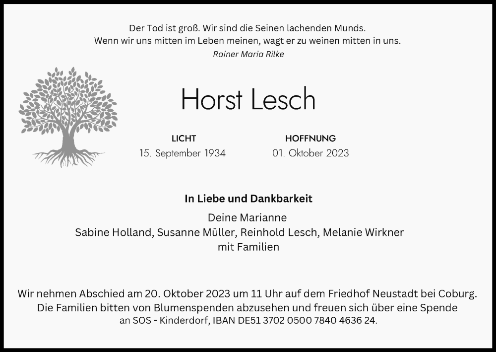 Hier finden Sie alle Traueranzeigen aus der Zeitung, die bisher für Horst Lesch erschienen sind. Weitere Traueranzeigen, die in der Zeitung erscheinen, werden hier ebenfalls aufgelistet