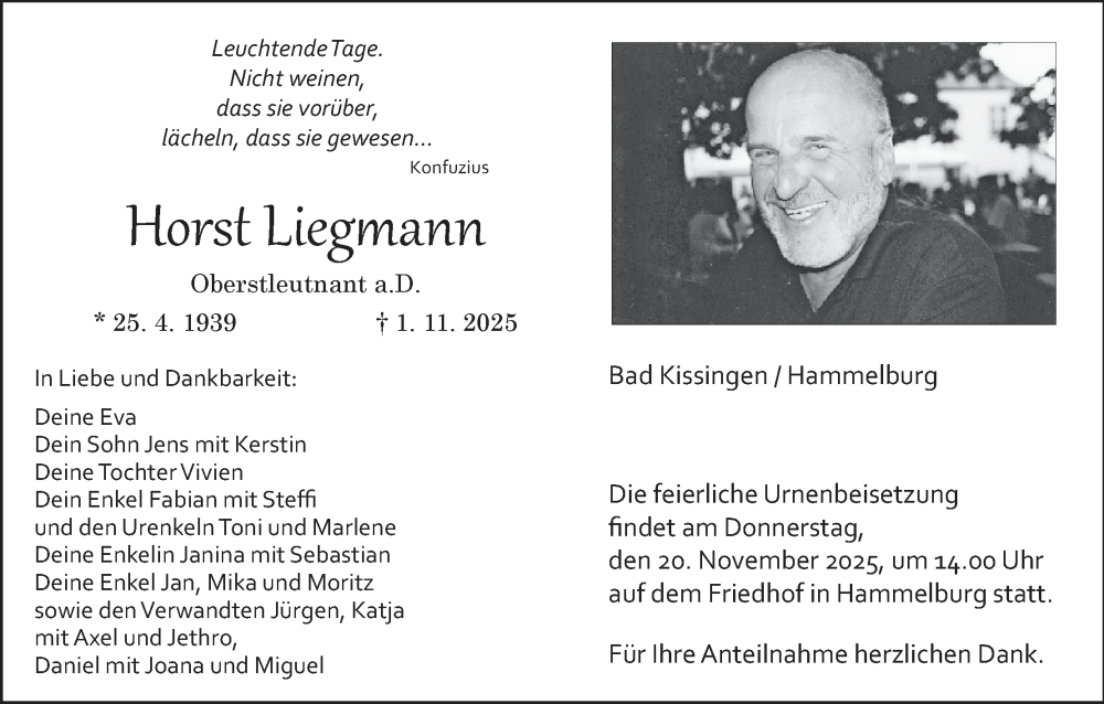 Hier finden Sie alle Traueranzeigen aus der Zeitung, die bisher für Horst Liegmann erschienen sind. Weitere Traueranzeigen, die in der Zeitung erscheinen, werden hier ebenfalls aufgelistet