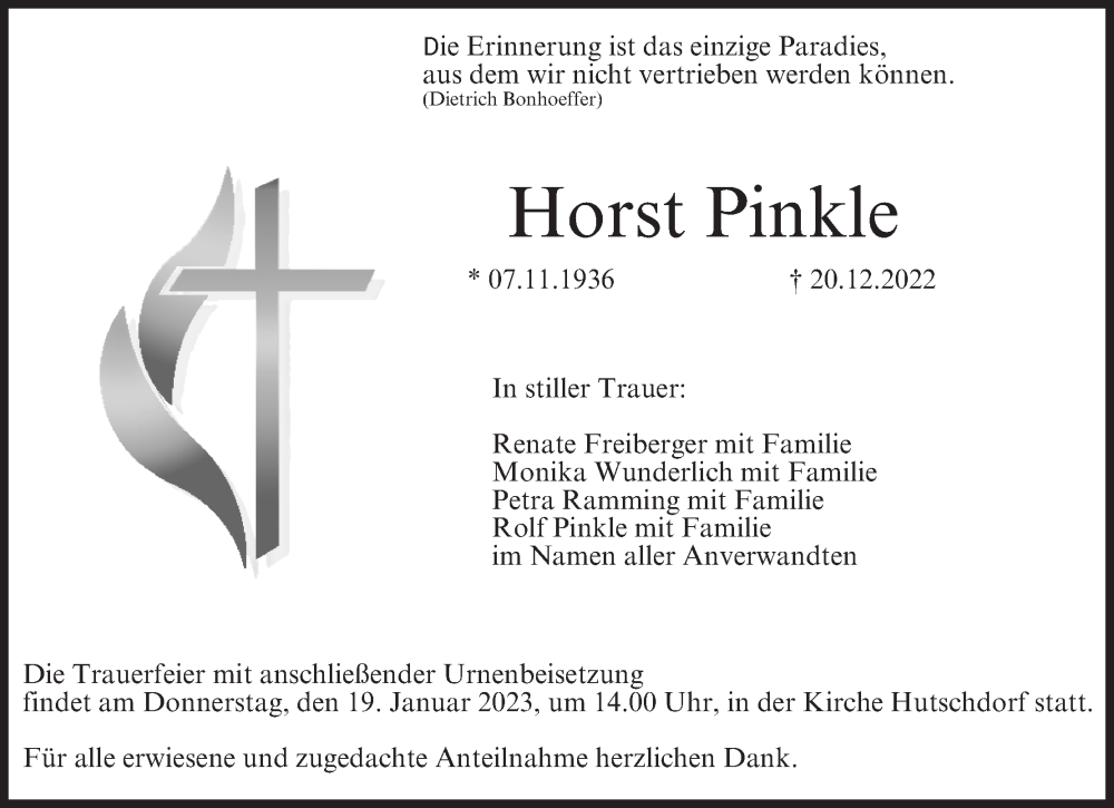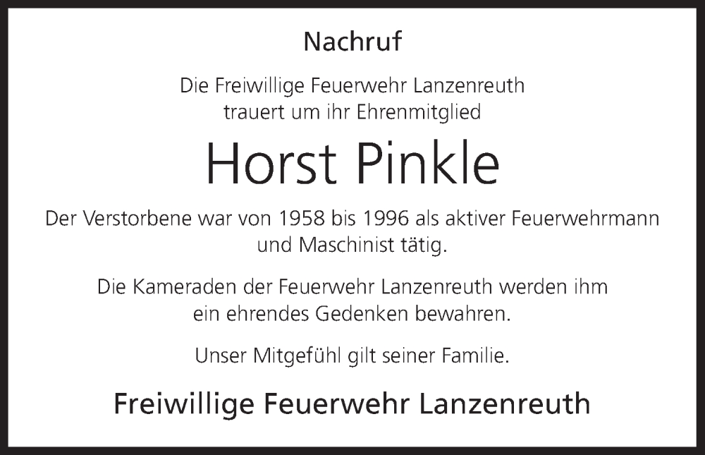 Hier finden Sie alle Traueranzeigen aus der Zeitung, die bisher für Horst Pinkle erschienen sind. Weitere Traueranzeigen, die in der Zeitung erscheinen, werden hier ebenfalls aufgelistet