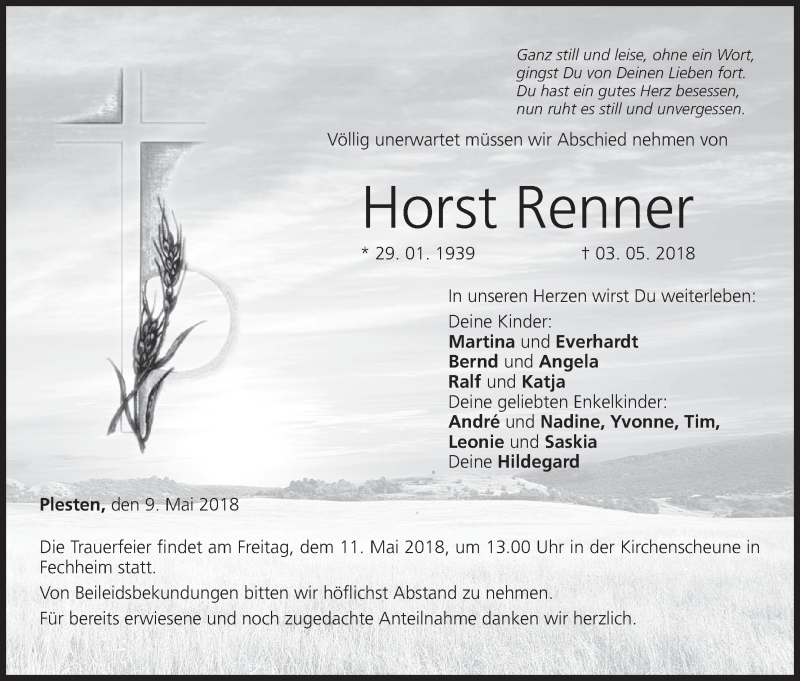 Hier finden Sie alle Traueranzeigen aus der Zeitung, die bisher für Horst Renner erschienen sind. Weitere Traueranzeigen, die in der Zeitung erscheinen, werden hier ebenfalls aufgelistet