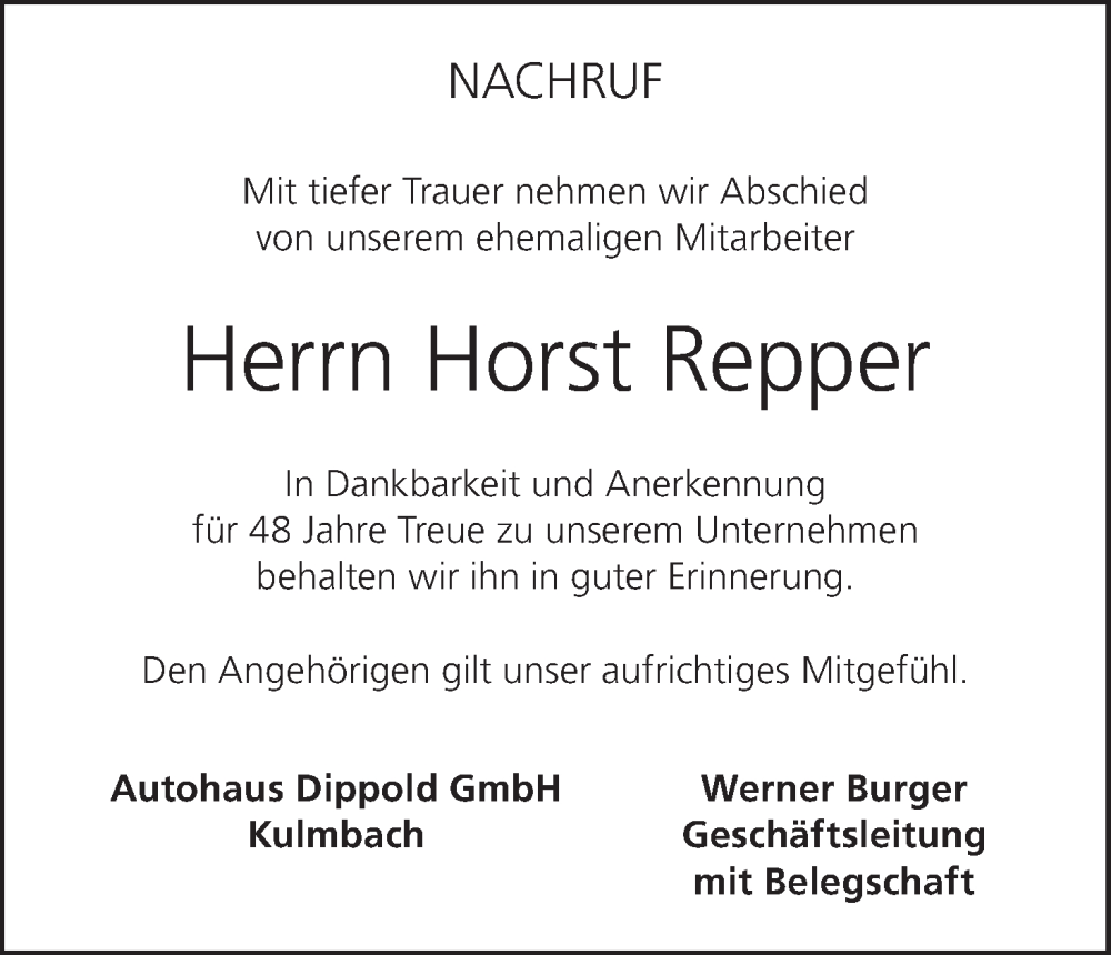 Hier finden Sie alle Traueranzeigen aus der Zeitung, die bisher für Horst Repper erschienen sind. Weitere Traueranzeigen, die in der Zeitung erscheinen, werden hier ebenfalls aufgelistet