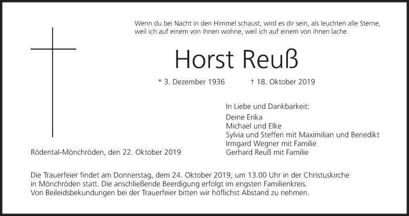 Hier finden Sie alle Traueranzeigen aus der Zeitung, die bisher für Horst Reuß erschienen sind. Weitere Traueranzeigen, die in der Zeitung erscheinen, werden hier ebenfalls aufgelistet