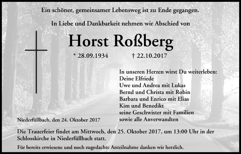 Hier finden Sie alle Traueranzeigen aus der Zeitung, die bisher für Horst Roßberg erschienen sind. Weitere Traueranzeigen, die in der Zeitung erscheinen, werden hier ebenfalls aufgelistet