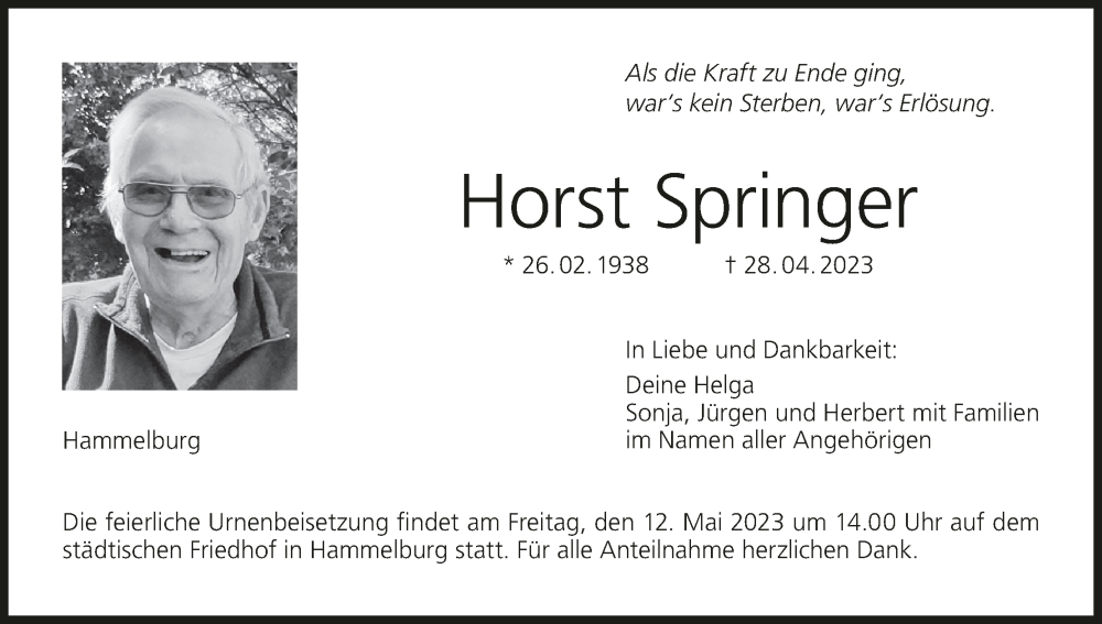 Hier finden Sie alle Traueranzeigen aus der Zeitung, die bisher für Horst Springer erschienen sind. Weitere Traueranzeigen, die in der Zeitung erscheinen, werden hier ebenfalls aufgelistet