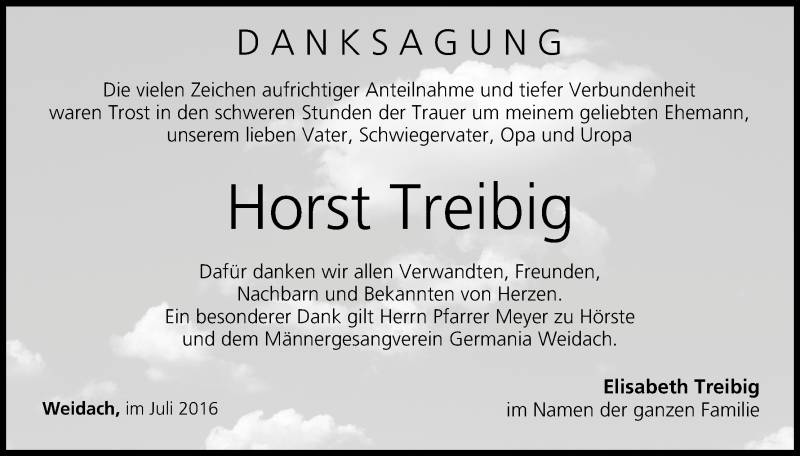 Hier finden Sie alle Traueranzeigen aus der Zeitung, die bisher für Horst Treibig erschienen sind. Weitere Traueranzeigen, die in der Zeitung erscheinen, werden hier ebenfalls aufgelistet