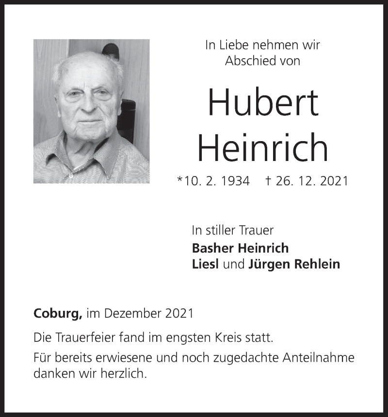 Hier finden Sie alle Traueranzeigen aus der Zeitung, die bisher für Hubert Heinrich erschienen sind. Weitere Traueranzeigen, die in der Zeitung erscheinen, werden hier ebenfalls aufgelistet
