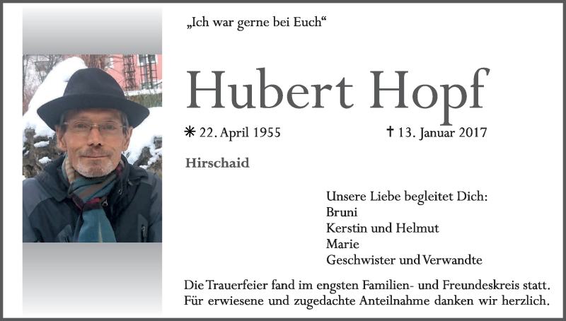 Hier finden Sie alle Traueranzeigen aus der Zeitung, die bisher für Hubert Hopf erschienen sind. Weitere Traueranzeigen, die in der Zeitung erscheinen, werden hier ebenfalls aufgelistet