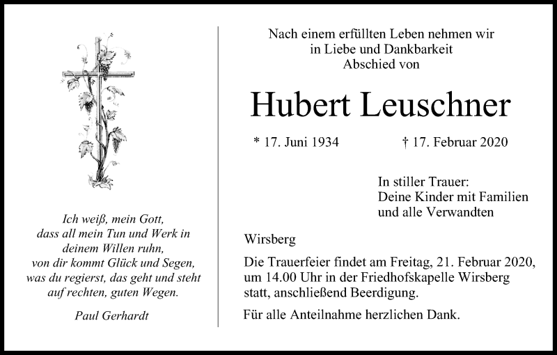 Hier finden Sie alle Traueranzeigen aus der Zeitung, die bisher für Hubert Leuschner erschienen sind. Weitere Traueranzeigen, die in der Zeitung erscheinen, werden hier ebenfalls aufgelistet