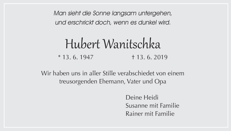 Hier finden Sie alle Traueranzeigen aus der Zeitung, die bisher für Hubert Wanitschka erschienen sind. Weitere Traueranzeigen, die in der Zeitung erscheinen, werden hier ebenfalls aufgelistet
