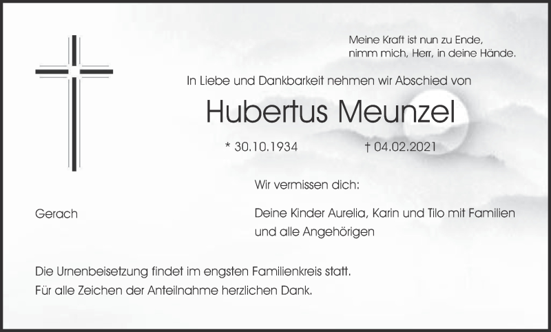 Hier finden Sie alle Traueranzeigen aus der Zeitung, die bisher für Hubertus Meunzel erschienen sind. Weitere Traueranzeigen, die in der Zeitung erscheinen, werden hier ebenfalls aufgelistet