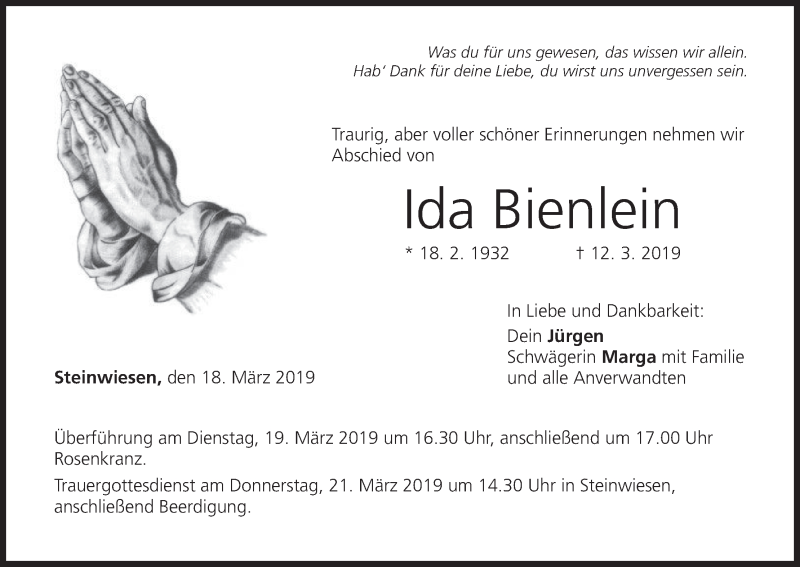 Hier finden Sie alle Traueranzeigen aus der Zeitung, die bisher für Ida Bienlein erschienen sind. Weitere Traueranzeigen, die in der Zeitung erscheinen, werden hier ebenfalls aufgelistet