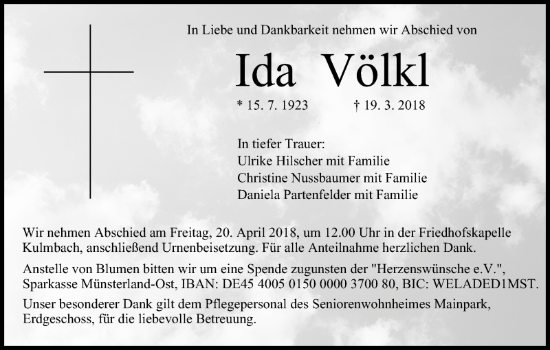 Hier finden Sie alle Traueranzeigen aus der Zeitung, die bisher für Ida Völkl erschienen sind. Weitere Traueranzeigen, die in der Zeitung erscheinen, werden hier ebenfalls aufgelistet
