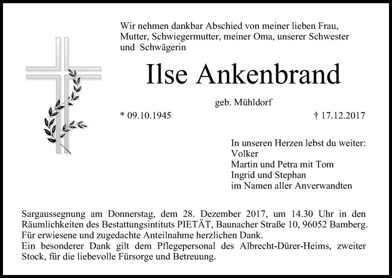 Hier finden Sie alle Traueranzeigen aus der Zeitung, die bisher für Ilse Ankenbrand erschienen sind. Weitere Traueranzeigen, die in der Zeitung erscheinen, werden hier ebenfalls aufgelistet