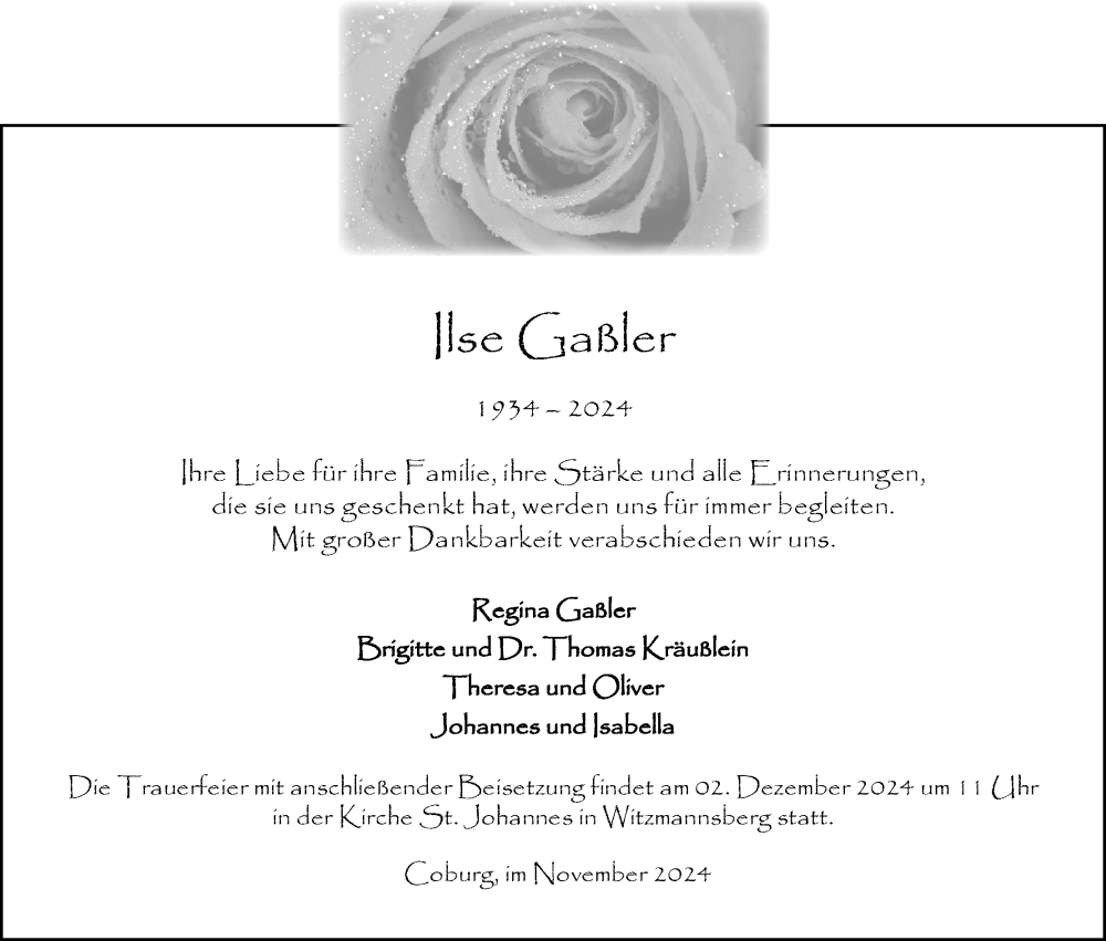 Hier finden Sie alle Traueranzeigen aus der Zeitung, die bisher für Ilse Gaßler erschienen sind. Weitere Traueranzeigen, die in der Zeitung erscheinen, werden hier ebenfalls aufgelistet
