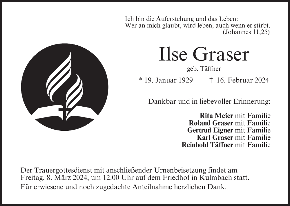 Hier finden Sie alle Traueranzeigen aus der Zeitung, die bisher für Ilse Graser erschienen sind. Weitere Traueranzeigen, die in der Zeitung erscheinen, werden hier ebenfalls aufgelistet