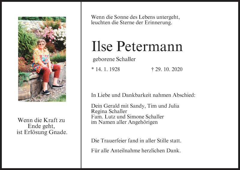 Hier finden Sie alle Traueranzeigen aus der Zeitung, die bisher für Ilse Petermann erschienen sind. Weitere Traueranzeigen, die in der Zeitung erscheinen, werden hier ebenfalls aufgelistet
