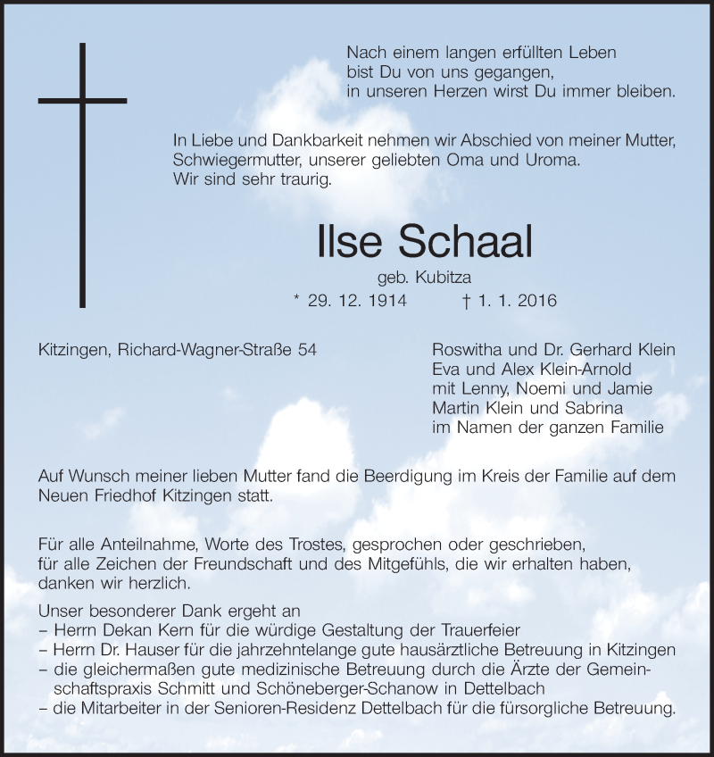 Hier finden Sie alle Traueranzeigen aus der Zeitung, die bisher für Ilse Schaal erschienen sind. Weitere Traueranzeigen, die in der Zeitung erscheinen, werden hier ebenfalls aufgelistet