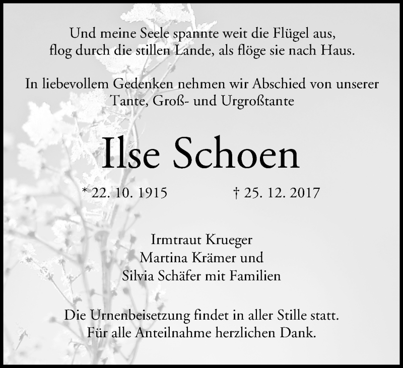 Hier finden Sie alle Traueranzeigen aus der Zeitung, die bisher für Ilse Schoen erschienen sind. Weitere Traueranzeigen, die in der Zeitung erscheinen, werden hier ebenfalls aufgelistet