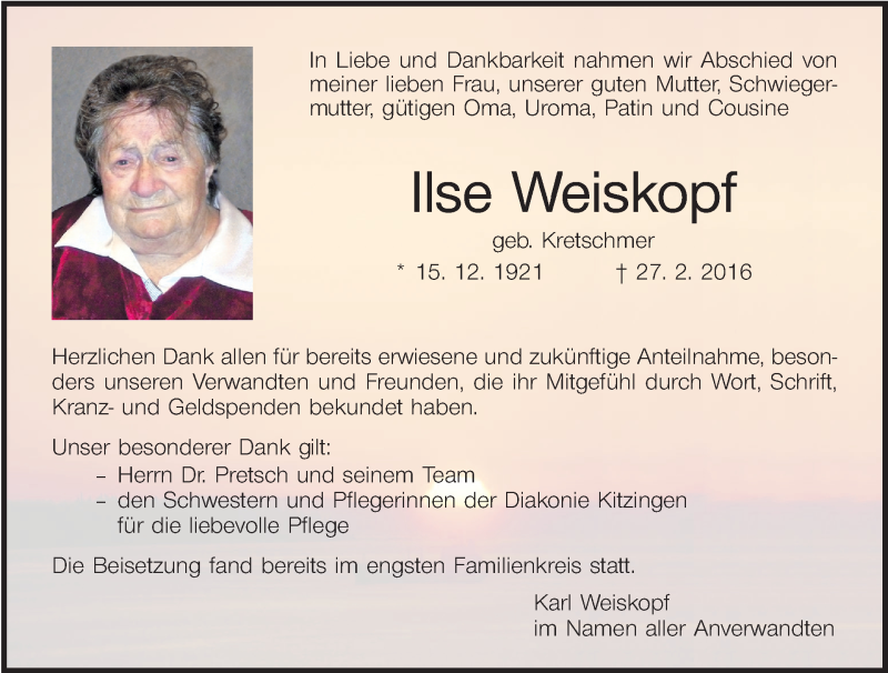 Hier finden Sie alle Traueranzeigen aus der Zeitung, die bisher für Ilse Weiskopf erschienen sind. Weitere Traueranzeigen, die in der Zeitung erscheinen, werden hier ebenfalls aufgelistet