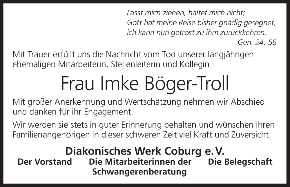 Hier finden Sie alle Traueranzeigen aus der Zeitung, die bisher für Imke Böger-Troll erschienen sind. Weitere Traueranzeigen, die in der Zeitung erscheinen, werden hier ebenfalls aufgelistet