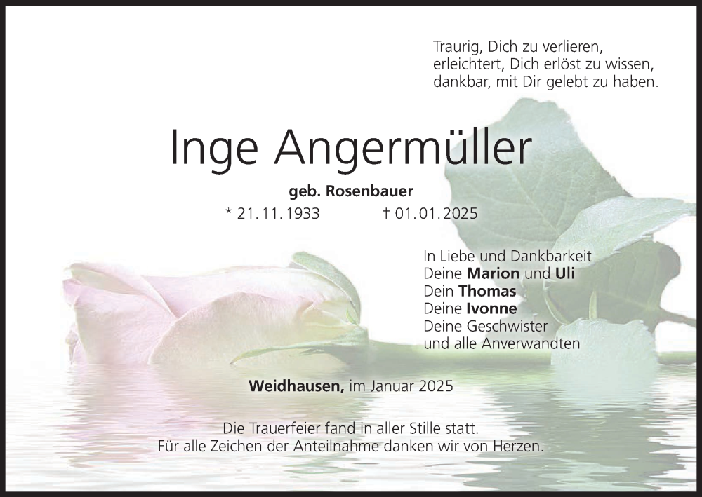 Hier finden Sie alle Traueranzeigen aus der Zeitung, die bisher für Inge Angermüller erschienen sind. Weitere Traueranzeigen, die in der Zeitung erscheinen, werden hier ebenfalls aufgelistet