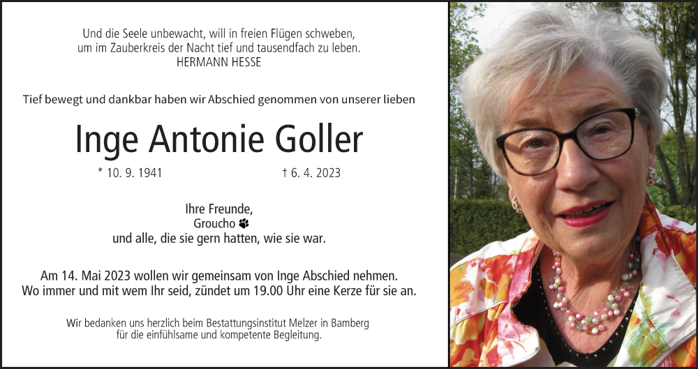 Hier finden Sie alle Traueranzeigen aus der Zeitung, die bisher für Inge Antonie Goller erschienen sind. Weitere Traueranzeigen, die in der Zeitung erscheinen, werden hier ebenfalls aufgelistet