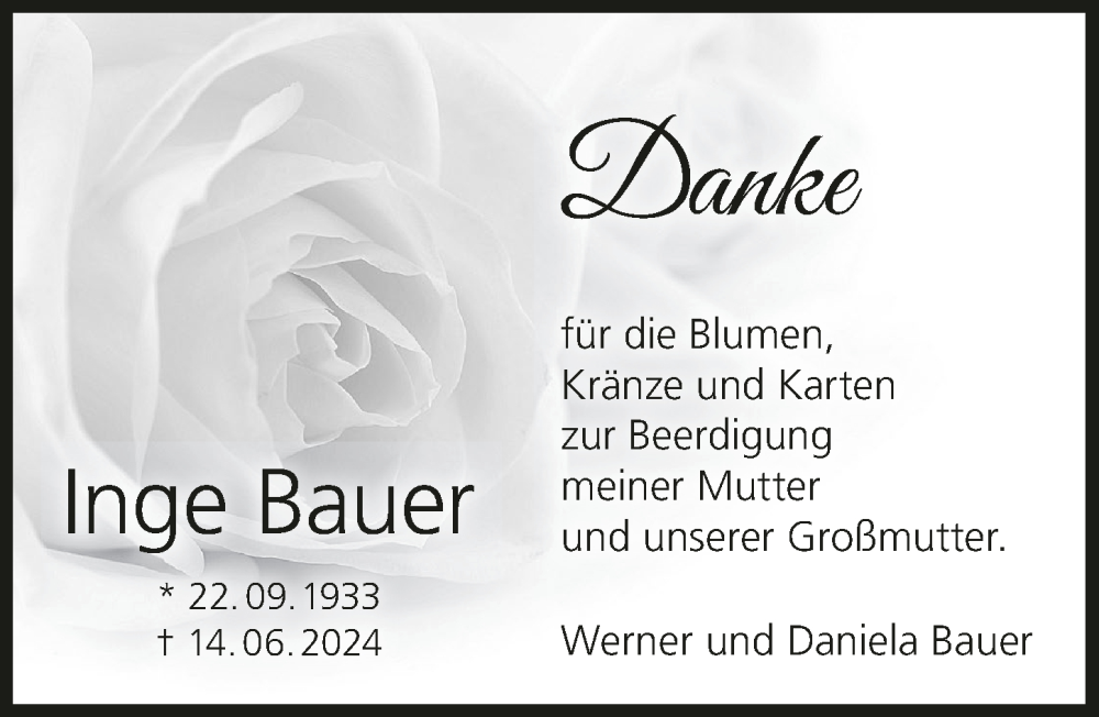 Hier finden Sie alle Traueranzeigen aus der Zeitung, die bisher für Inge Bauer erschienen sind. Weitere Traueranzeigen, die in der Zeitung erscheinen, werden hier ebenfalls aufgelistet