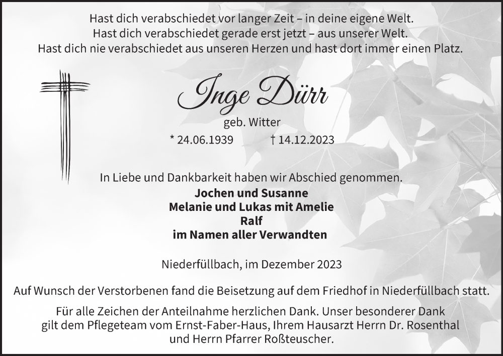 Hier finden Sie alle Traueranzeigen aus der Zeitung, die bisher für Inge Dürr erschienen sind. Weitere Traueranzeigen, die in der Zeitung erscheinen, werden hier ebenfalls aufgelistet