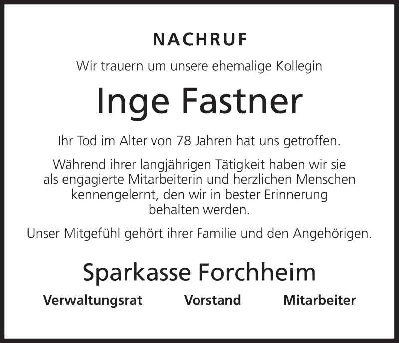 Hier finden Sie alle Traueranzeigen aus der Zeitung, die bisher für Inge Fastner erschienen sind. Weitere Traueranzeigen, die in der Zeitung erscheinen, werden hier ebenfalls aufgelistet