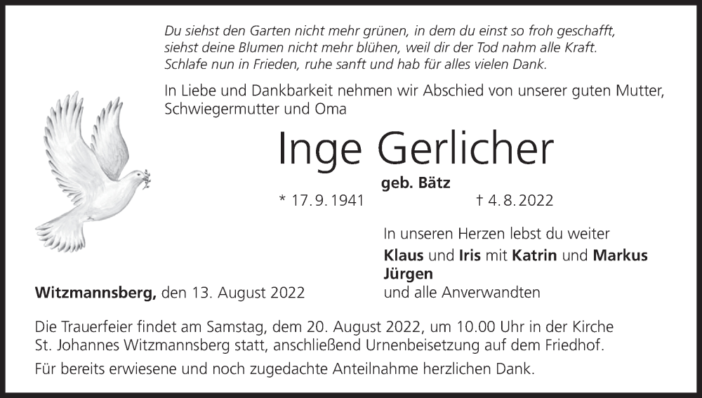 Hier finden Sie alle Traueranzeigen aus der Zeitung, die bisher für Inge Gerlicher erschienen sind. Weitere Traueranzeigen, die in der Zeitung erscheinen, werden hier ebenfalls aufgelistet
