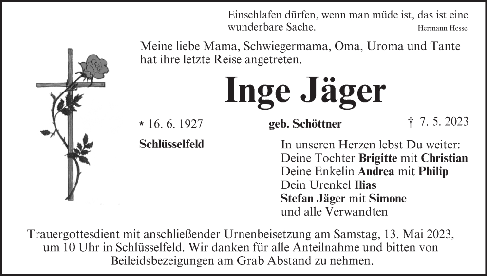 Hier finden Sie alle Traueranzeigen aus der Zeitung, die bisher für Inge Jäger erschienen sind. Weitere Traueranzeigen, die in der Zeitung erscheinen, werden hier ebenfalls aufgelistet