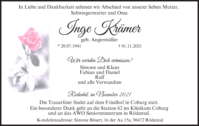 Hier finden Sie alle Traueranzeigen aus der Zeitung, die bisher für Inge Krämer erschienen sind. Weitere Traueranzeigen, die in der Zeitung erscheinen, werden hier ebenfalls aufgelistet