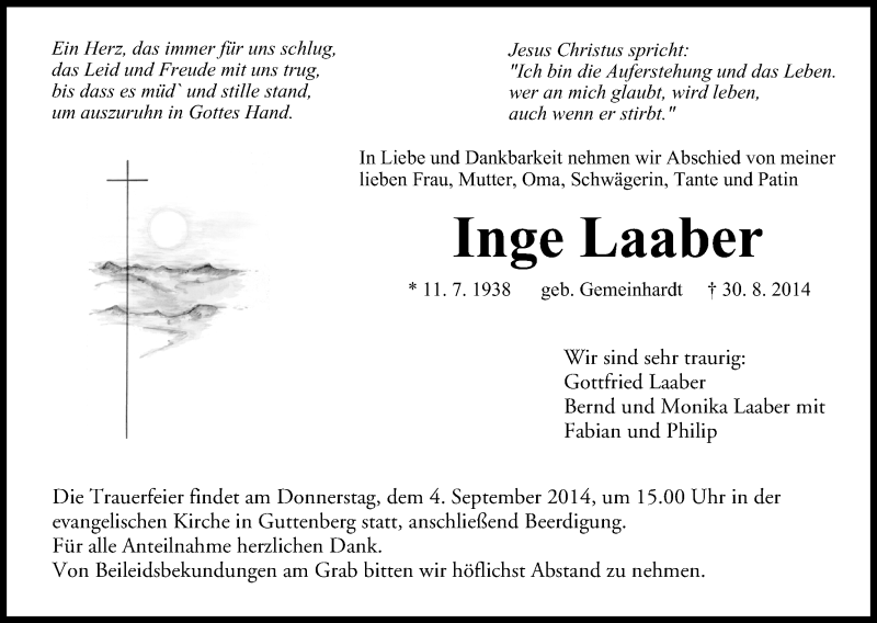 Hier finden Sie alle Traueranzeigen aus der Zeitung, die bisher für Inge Laaber erschienen sind. Weitere Traueranzeigen, die in der Zeitung erscheinen, werden hier ebenfalls aufgelistet