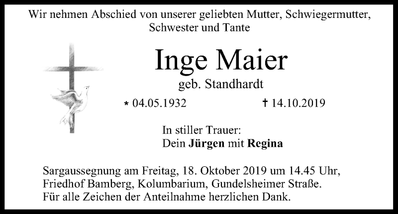 Hier finden Sie alle Traueranzeigen aus der Zeitung, die bisher für Inge Maier erschienen sind. Weitere Traueranzeigen, die in der Zeitung erscheinen, werden hier ebenfalls aufgelistet