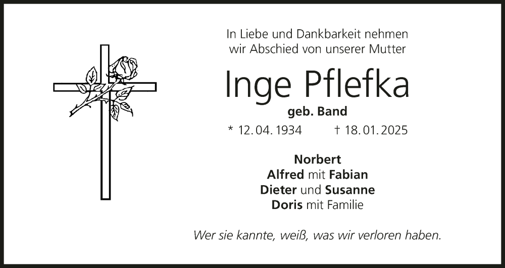 Hier finden Sie alle Traueranzeigen aus der Zeitung, die bisher für Inge Pflefka erschienen sind. Weitere Traueranzeigen, die in der Zeitung erscheinen, werden hier ebenfalls aufgelistet