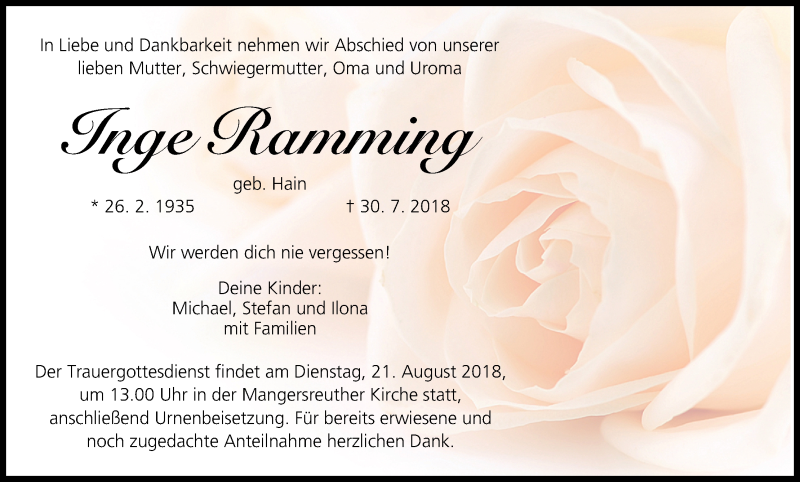 Hier finden Sie alle Traueranzeigen aus der Zeitung, die bisher für Inge Ramming erschienen sind. Weitere Traueranzeigen, die in der Zeitung erscheinen, werden hier ebenfalls aufgelistet