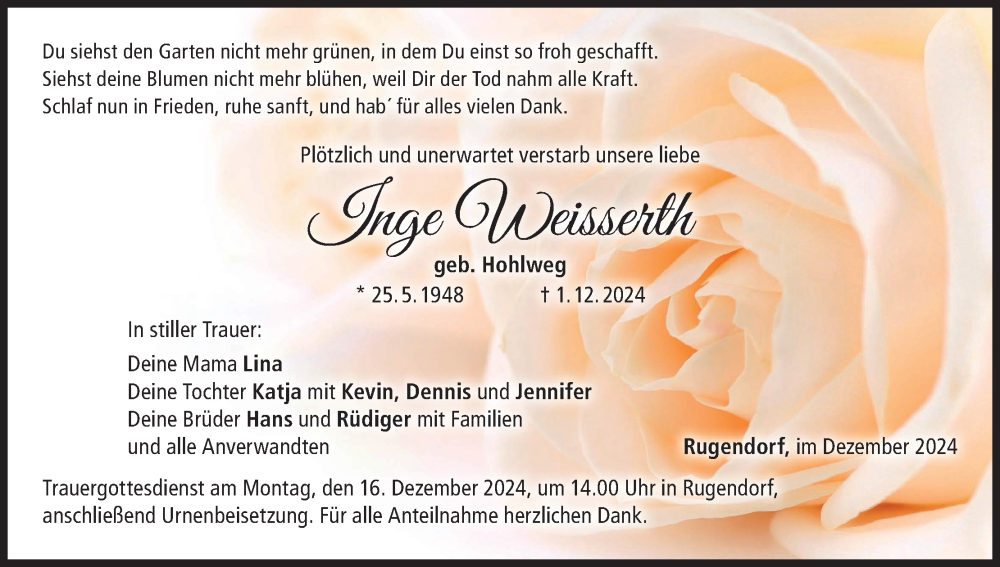 Hier finden Sie alle Traueranzeigen aus der Zeitung, die bisher für Inge Weisserth erschienen sind. Weitere Traueranzeigen, die in der Zeitung erscheinen, werden hier ebenfalls aufgelistet