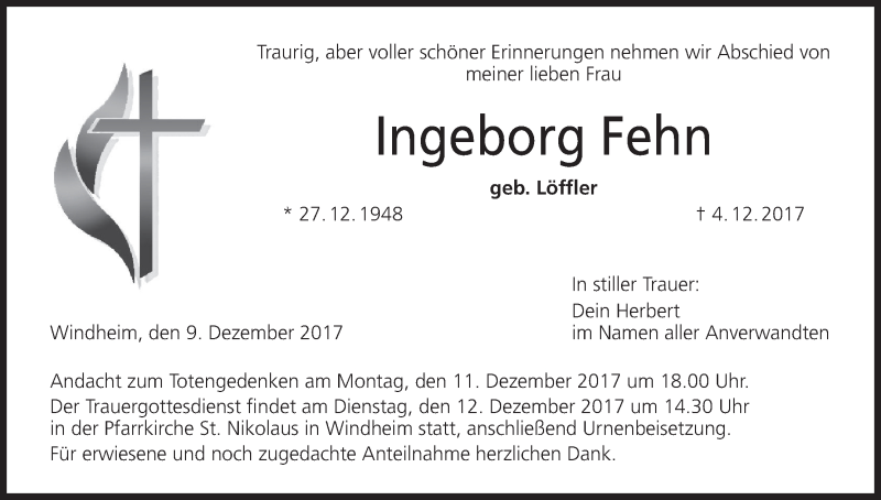 Hier finden Sie alle Traueranzeigen aus der Zeitung, die bisher für Ingeborg Fehn erschienen sind. Weitere Traueranzeigen, die in der Zeitung erscheinen, werden hier ebenfalls aufgelistet