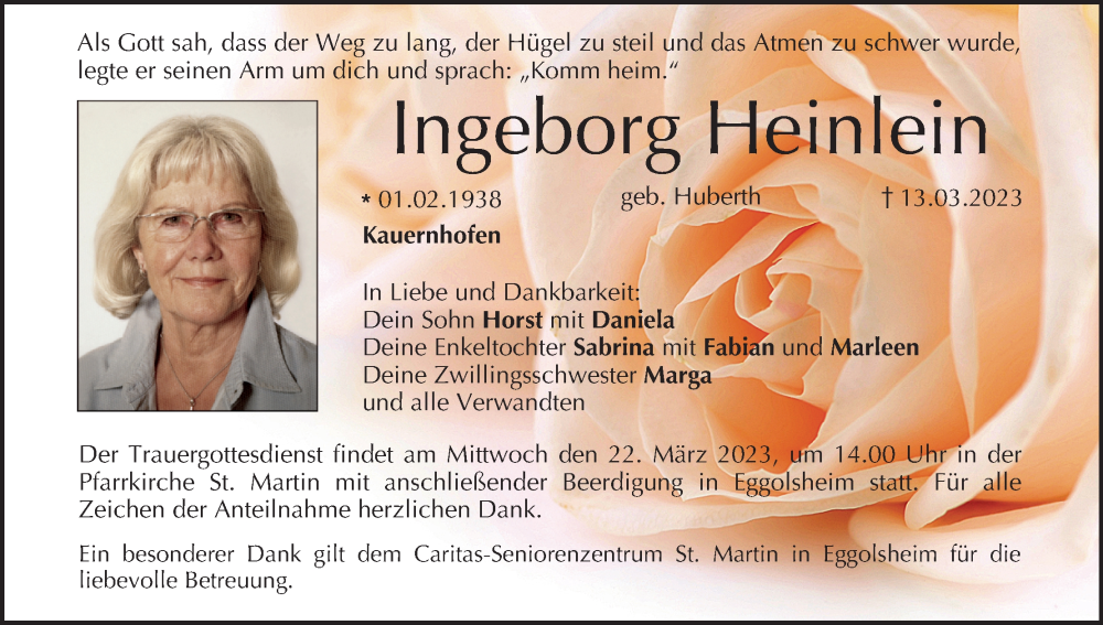 Hier finden Sie alle Traueranzeigen aus der Zeitung, die bisher für Ingeborg Heinlein erschienen sind. Weitere Traueranzeigen, die in der Zeitung erscheinen, werden hier ebenfalls aufgelistet