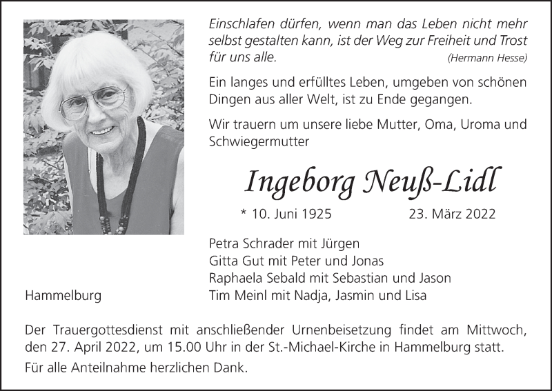 Hier finden Sie alle Traueranzeigen aus der Zeitung, die bisher für Ingeborg Neuß-Lidl erschienen sind. Weitere Traueranzeigen, die in der Zeitung erscheinen, werden hier ebenfalls aufgelistet