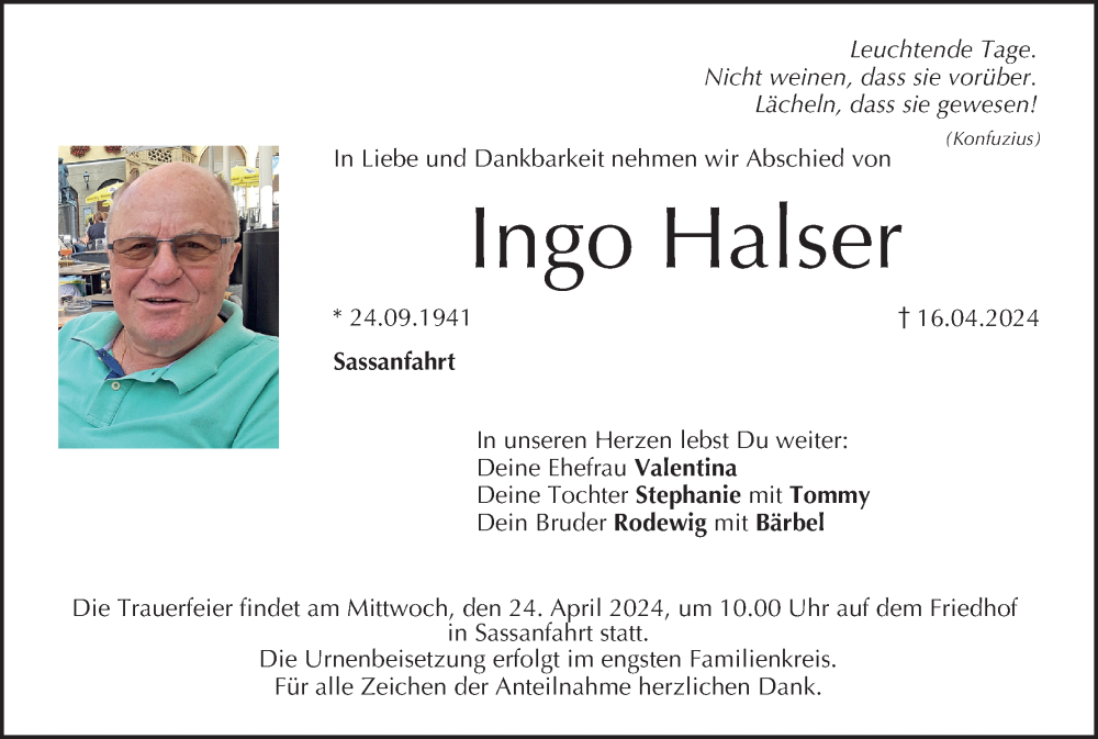 Hier finden Sie alle Traueranzeigen aus der Zeitung, die bisher für Ingo Halser erschienen sind. Weitere Traueranzeigen, die in der Zeitung erscheinen, werden hier ebenfalls aufgelistet