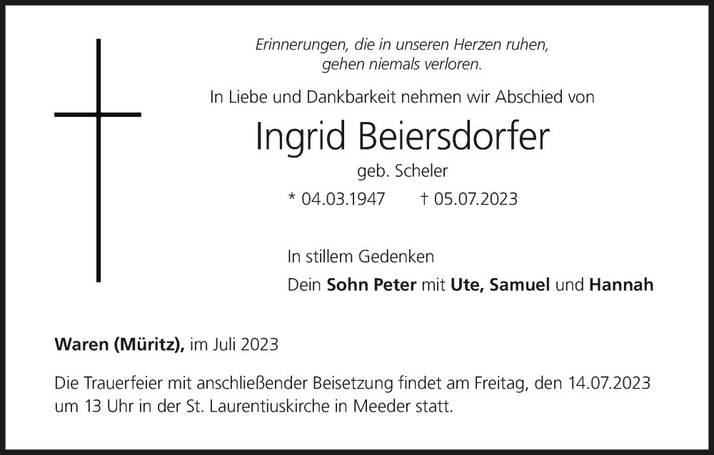 Hier finden Sie alle Traueranzeigen aus der Zeitung, die bisher für Ingrid Beiersdorfer erschienen sind. Weitere Traueranzeigen, die in der Zeitung erscheinen, werden hier ebenfalls aufgelistet